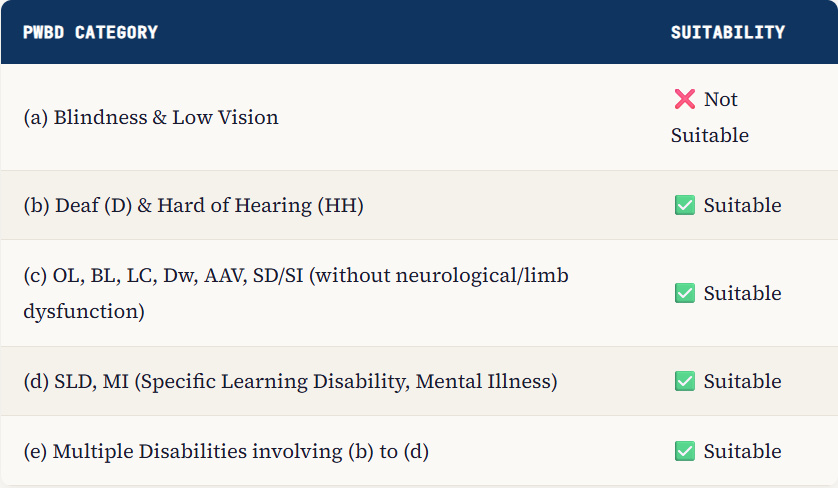 | PwBD Category | Suitability |