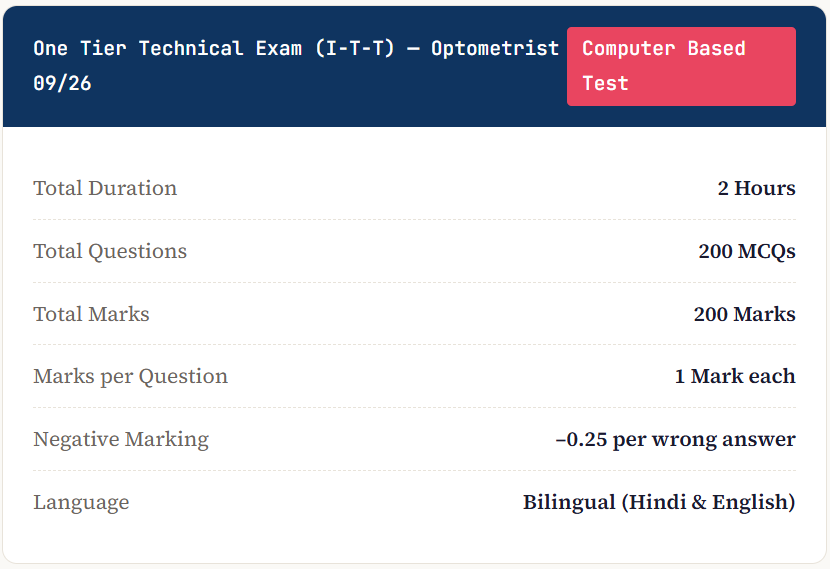 The Optometrist post follows the One Tier (Technical) Examination Scheme — I-T-T. This is a single-stage computer-based test (CBT) with two sections.
